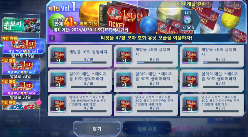야옹이 SD 건담 지제네 이건 챙겨봐야겠어요 [기타] 작성일시 : 2026. 03. 27 (13:59) 조회 : 32 / 댓글 : 1 SD건담 지제네 곧있으면 1주년이라고카운드 다운 출석에 패널 미션 등장했어요 ㅋㅋㅋ이것들만 다 챙겨도 최대 47연속 유닛 티켓으로꽁으로 UR 먹고, 다량의 다이아까지 쟁여볼 수 있어당분간 쭉 손대볼 생각입니다 1추천 글쓰기스크랩 신고