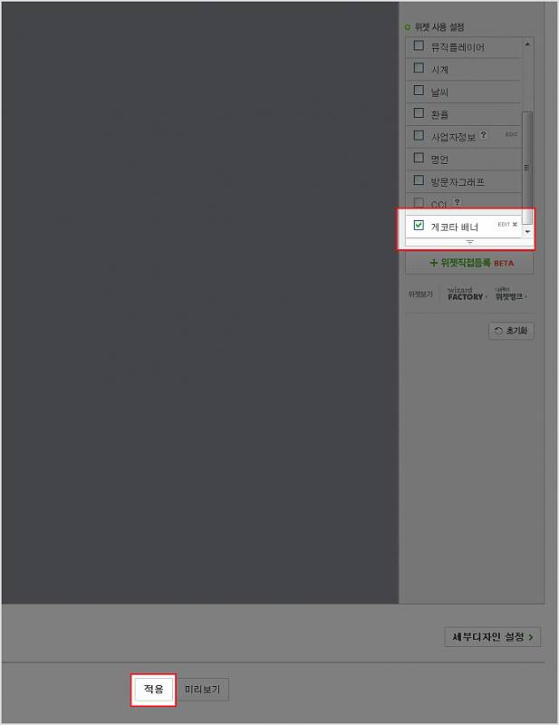 4. 위젯을 생성하면 아래와 같이 추가됩니다. 하단의 적용을 누르면 블로그에 게코타 배너가 추가됩니다.