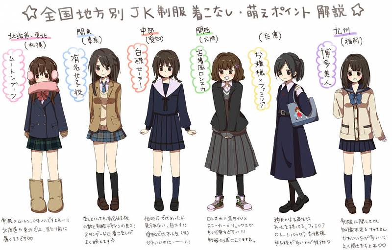 세희 일본 전국 지방별 여고생 교복 비교 그림 [애니] 작성일시 : 2013. 01. 24 (15:40) 조회 : 4,350 / 댓글 : 15 왼쪽부터 '홋카이도 & 동북 지방 - 삿포로', '관동 지방 - 도쿄', '중부 지방 - 아이치', '관서 지방 - 오사카', '관서 지방 - 효고', '규슈 지방 - 후쿠오카'라고 되어 있음.. 0추천 글쓰기스크랩 신고