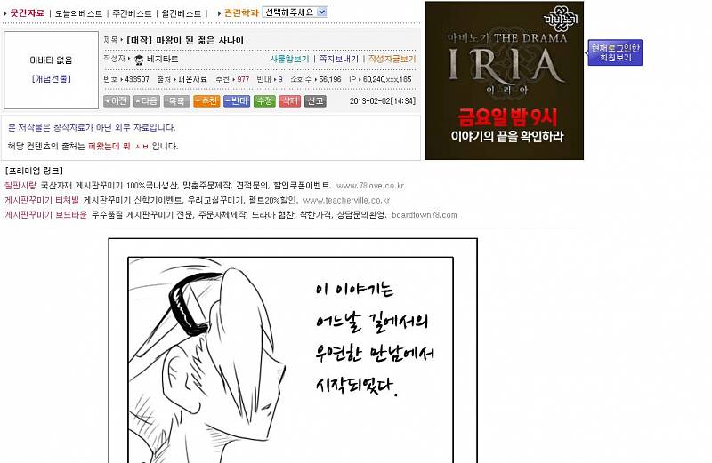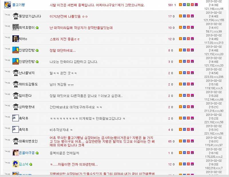 흰꽃 [전설]마왕이야기 (만든인간 - 물고기빵) (웃대 퍼옴) [애니] 작성일시 : 2013. 03. 08 (19:47) 조회 : 5,723 / 댓글 : 5 보너스 물고기빵이라고 이런 류의 만화를 창작으로 그려서 각 사이트에 퍼트리시는 분으로 꽤 유명했죠. 거의 웃대에서만 활동하신다고 했는데 최근에는 활동이 별로 없으시더군요.(거의 몇년 잠수) 그러던 어느날.. 웃대 베스트에 [대작]마왕 이 된 젊은 사나이라는 글이 올라오고............ 이 글을 보고 화가난 물고기빵은 이런말을 남깁니다. -ㅅ- 웃대인은 이 글을 보고 레전드의 귀환이라고 하죠. 0추천 글쓰기스크랩 신고