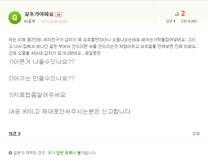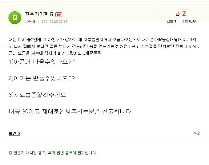 샤샤 (여성분들 클릭주의) 요도파열 [애니] 작성일시 : 2011. 05. 14 (21:15) 조회 : 5,539 / 댓글 : 10 방금 심심해서 네이버에 '꼬추'를 쳐봤습니다. 그랫더니... 꼬추가 아픈분이 있더군요.. 그래서 고민을 상담해주려고 (본심은 심심해서) 검색해보았죠. . . . . . . . . . ...정말 대단한 여친이군요 저는 저런여자 만나면 안되겠어요 보너스 많아!? 0추천 글쓰기스크랩 신고