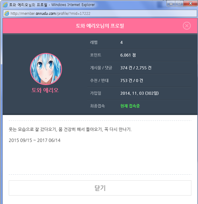 포도님.. 포도님.. 온나다 활동.. 여..열심히.. 해주셔서.. 고..고맙습..니닷!! 그..그리고 !! 하..항상.. 시..신경 써주셔서.. 고..고마워요!!