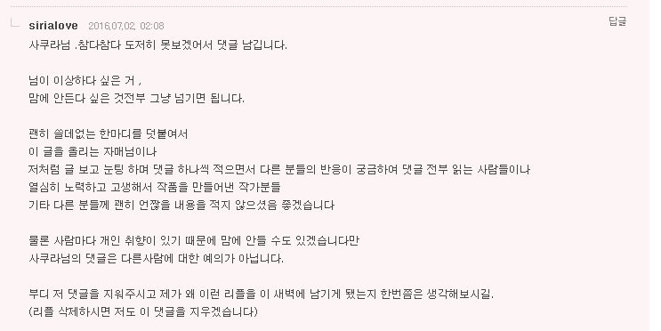 그 사람에게 답댓글 달면 또 뭔가 큰 일이 벌어 질것 같아서 내 댓글은 지우고