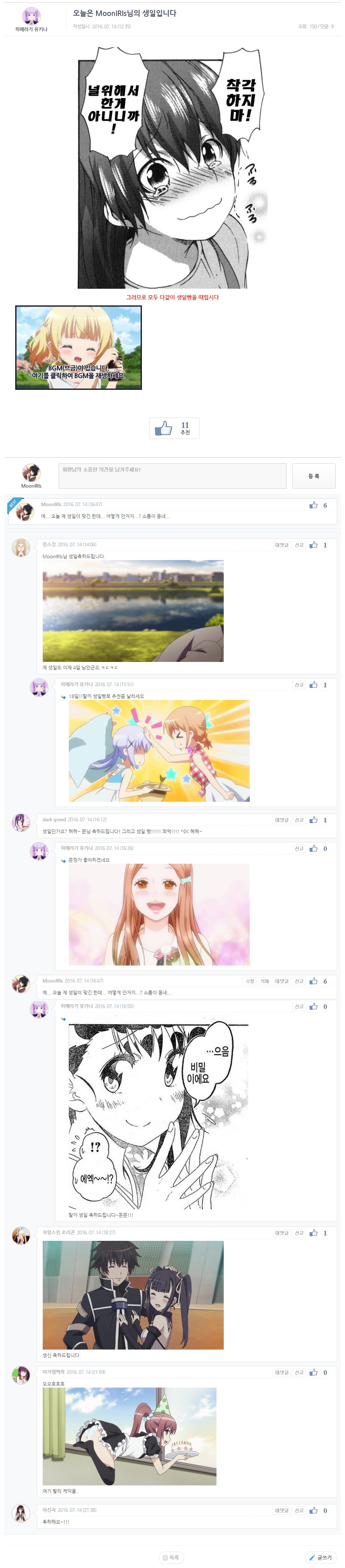 MoonIRIs 생일을 축하해주신 분들 모두 감사합니다!! [애니] 작성일시 : 2016. 07. 14 (22:40) 조회 : 2,895 / 댓글 : 7 어떤 변태아찌가 제 생일 축하 글을 올리고 많은 분들이 댓글로 축하를 해주셨군요!! 그리고 개인적으로 쪽지로 축하를 해주신 분들도 계시고요!! 모두모두모두 정말 감사합니다!! 에헤헤... 진짜 이렇게 축하 받을줄은 예상도 못했네요?? 다시 한번 많은 분들께 감사의 말을!! P.S 근데 제 생일을 어떻게 알았데요... 변태아찌... 무서워... 7추천 글쓰기스크랩 신고