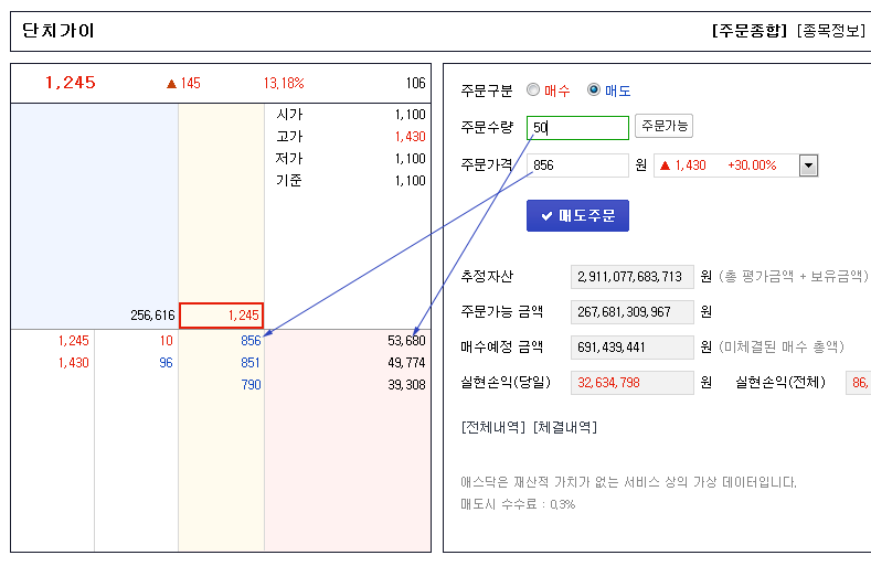 매도에 선택합니다. 50주를 1주당 856원에 팔겠다는 것입니다. 화살표가 가리킨 것처럼 사는 사람들이 있으면 즉시 체결됩니다.