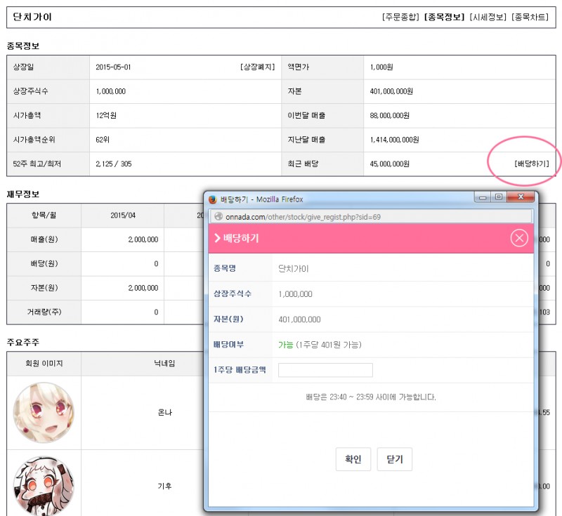 대주주가 되면은 [종목정보] 화면에서 배당하기 버튼을 클릭하여 배당시간에 자본만큼 배당할 수 있습니다.