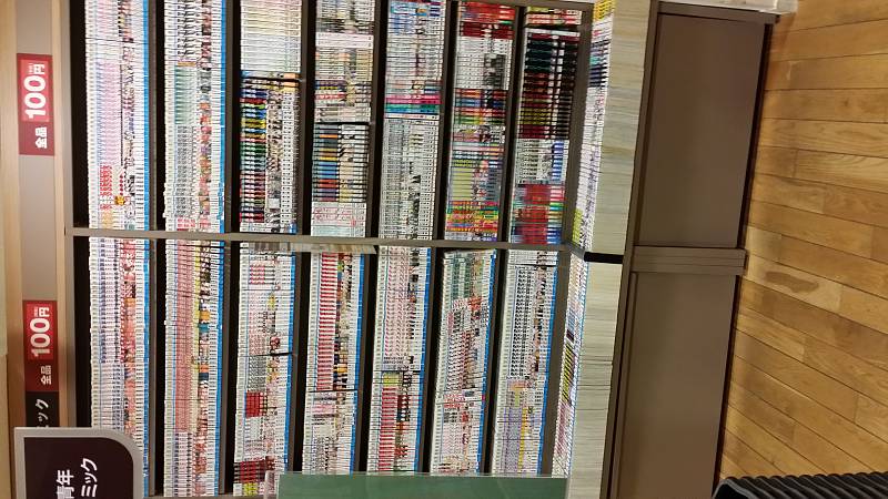 그곳에는 일반문예부터 코믹스, 라노벨까지 컬렉션들이 쫘악 깔려 있었는데요. 그중에서 눈에 띄는 것이 '전품​ 100엔'이라고 쓰인 코너들입니다!
