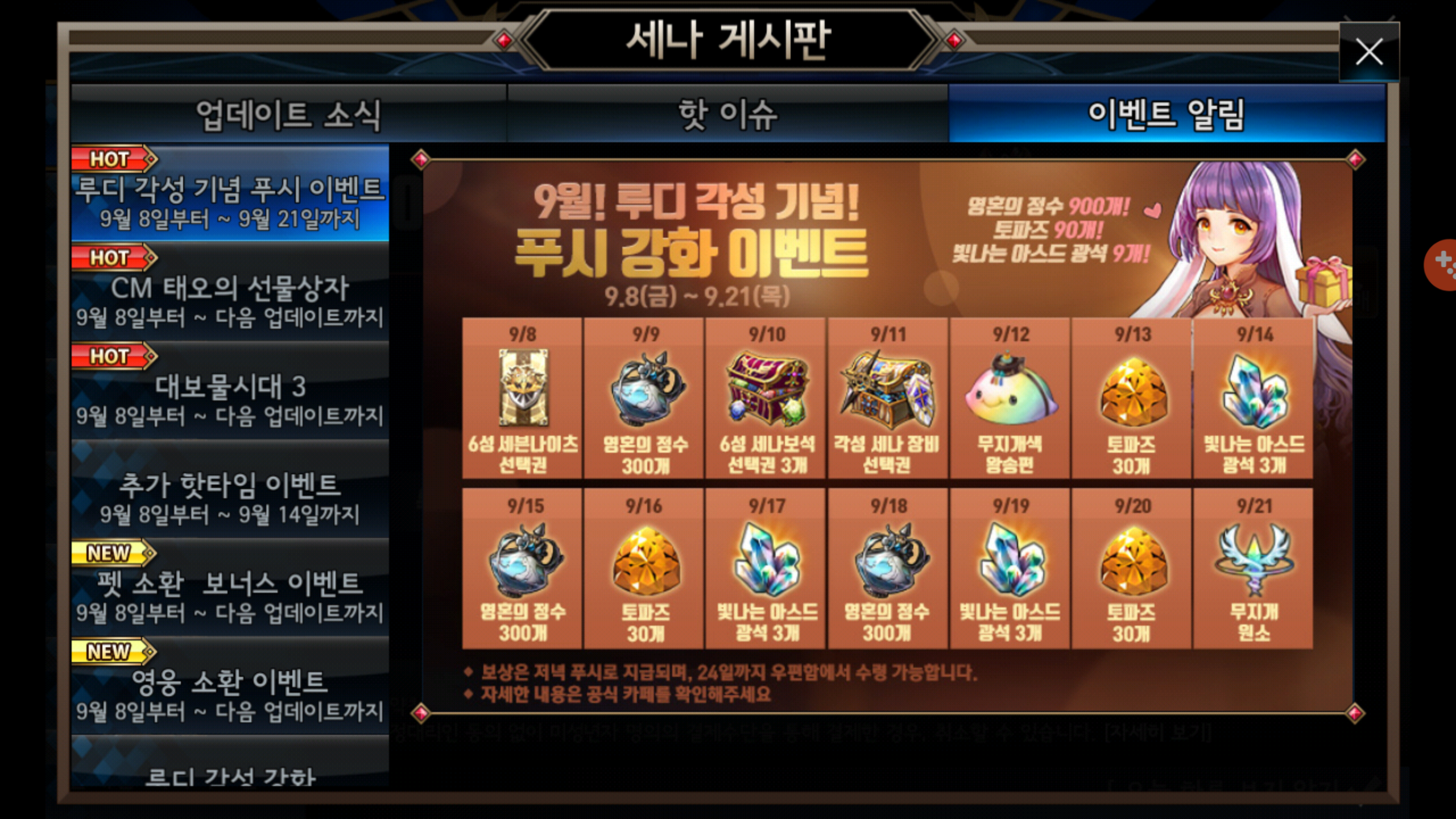 거기다 루디 각성 기념으로 푸시 이벤트도 진행 중이네요.
