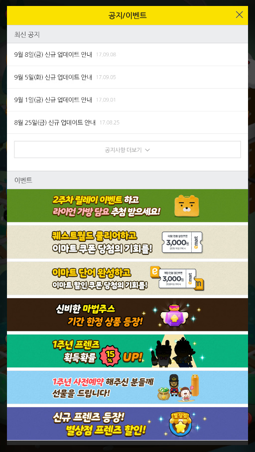 휘핑크림 오.. 프렌즈사천성 벌써 1주년...;; [일반] 작성일시 : 2017. 09. 14 (17:21) 조회 : 3,381 / 댓글 : 0 프렌즈사천성이 벌써 1주년이 다 됐네요지금까지 나와있는 사천성 게임들 중에패 보기도 쉽고 카카오프렌즈 모으는 맛에 해왔는데나온지 벌써 1년이나 지났다니..;; 1주년을 맞이하면서 이마트 쿠폰주는 이벤트도 하고한판만해도 미스스마일 이모티콘을 주고..카카오프렌즈 무릎담요까지 주더라구요요즘 미션랭킹도 바뀌고 알바랜드까지 추가돼서전보다 훨씬 재밌어졌는데이벤트까지 많아져서 훨씬 좋네요 ㅎㅎ 1추천 글쓰기스크랩 신고