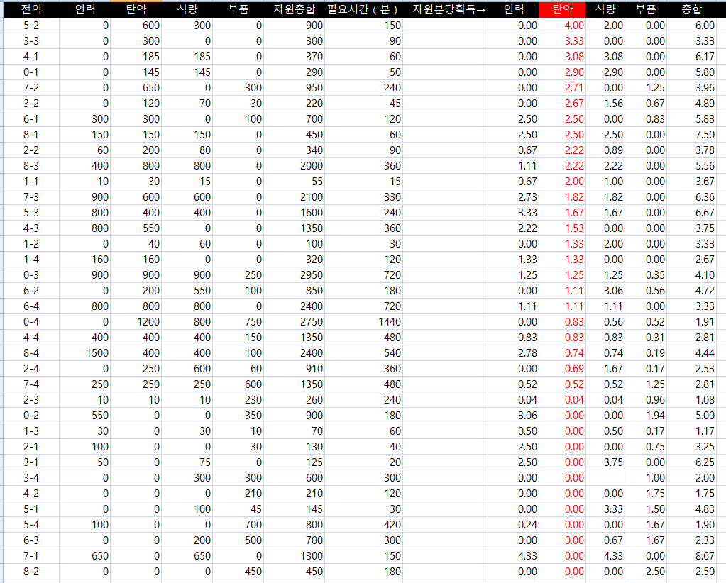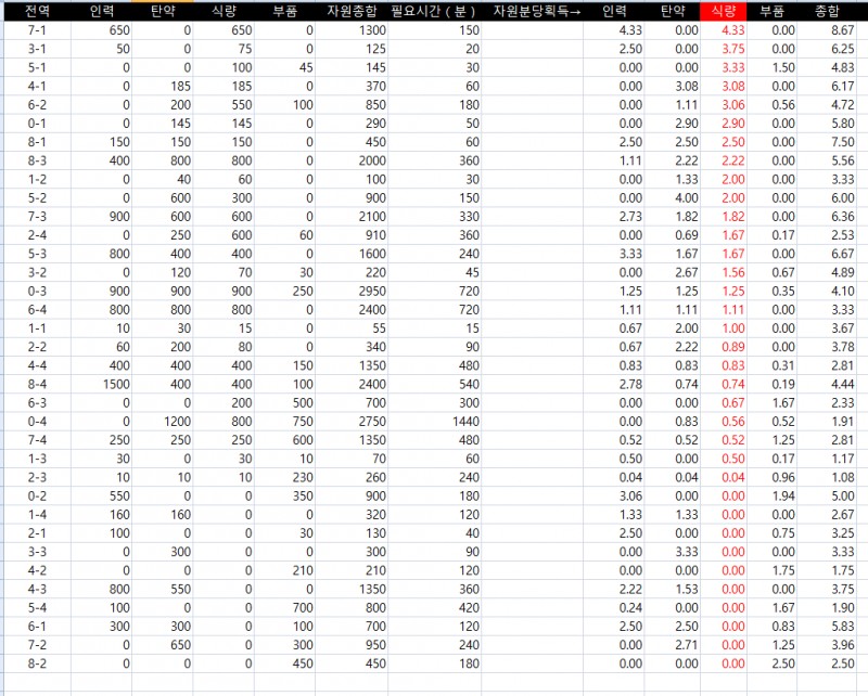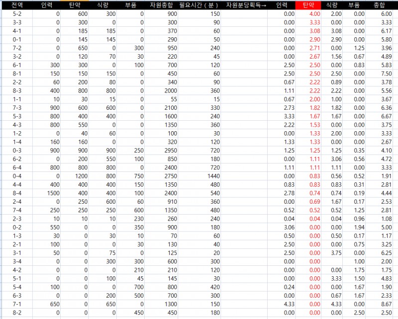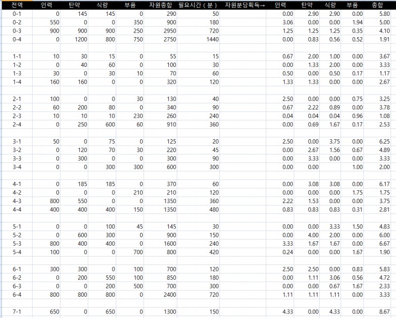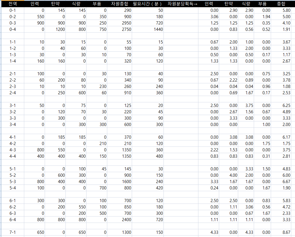 어느 군수지원이 효율적일지 볼 때마다 다르길래, 이참에 액셀로 수식을 짜서 만들어보았습니다.