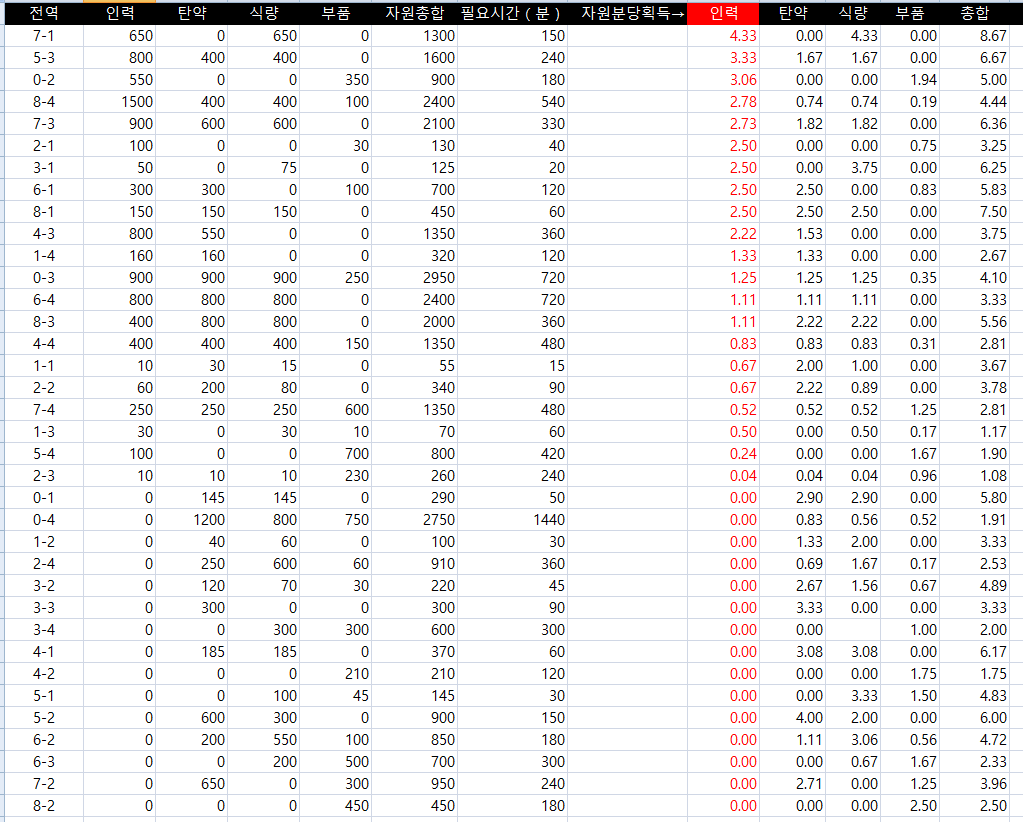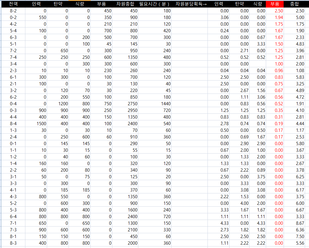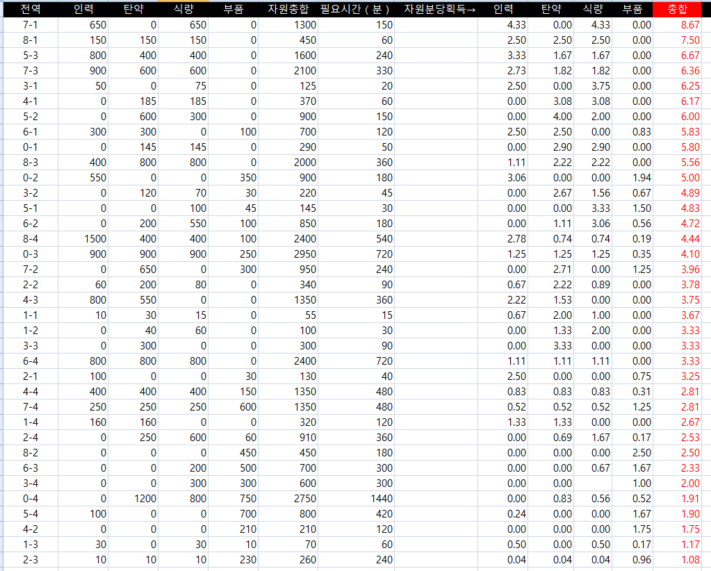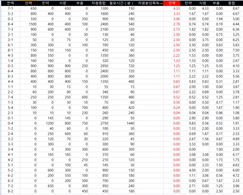 어느 군수지원이 효율적일지 볼 때마다 다르길래, 이참에 액셀로 수식을 짜서 만들어보았습니다.