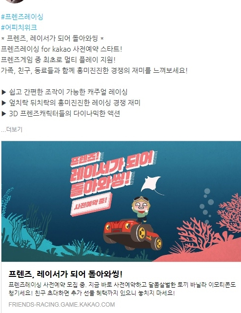 휘핑크림 프렌즈레이싱 마지막 위크 공개! [일반] 작성일시 : 2017. 10. 11 (15:37) 조회 : 2,798 / 댓글 : 1 프렌즈레이싱의 마지막 주차인어피치 위크가 공개됐습니다지금까지 레이서로 변한 프렌즈의 모습을 많이 보았지만어피치의 모습이 가장 귀여운 것 같음..ㅎㅎ 거기다가 지금 프렌즈레이싱 사전예약 이벤트를SNS에 해시태그를 남겨서 공유하면추첨을 통해 어피치 리틀프렌즈 인형까지 증정한다고 하는데 공유 이벤트에 이렇게 참여했으니리틀프렌즈 인형을 저에게 주었으면..ㅋㅋㅋㅋㅋㅋ 0추천 글쓰기스크랩 신고