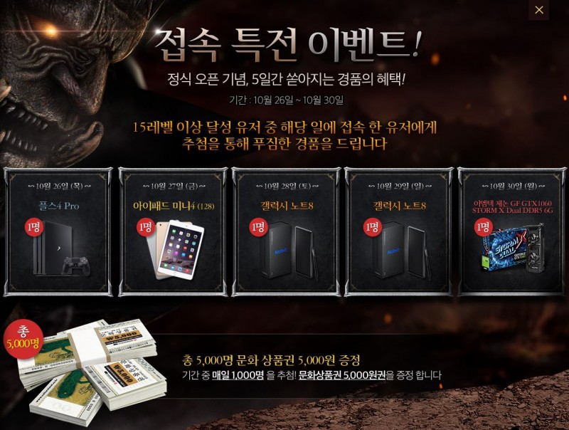 15레벨 이상 달성 유저 중 해당일자에 접속만 하면 추첨을 통해 경품을 지급해주는 이벤트를 하더라고요.