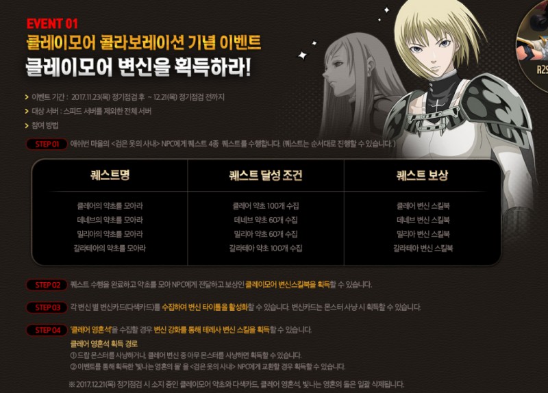 레벨업하면서 약초도 구하고 클레이모어 콜라보레이션 캐릭터 변신도 얻고