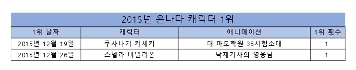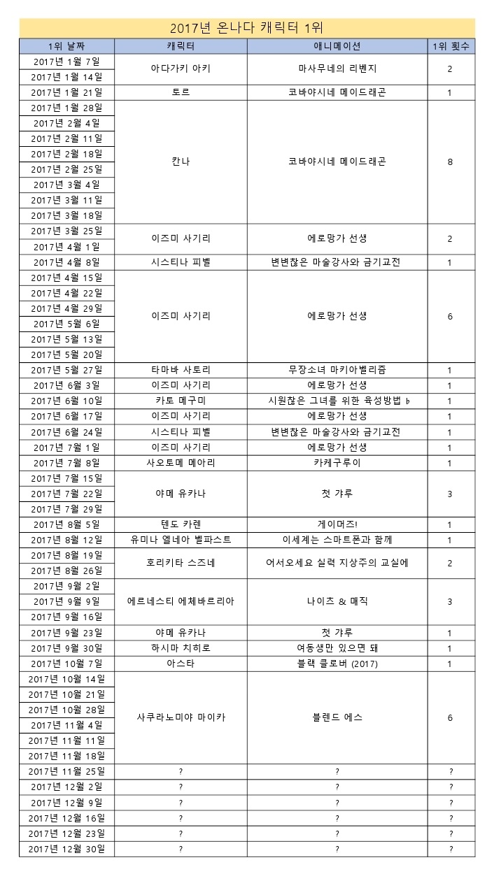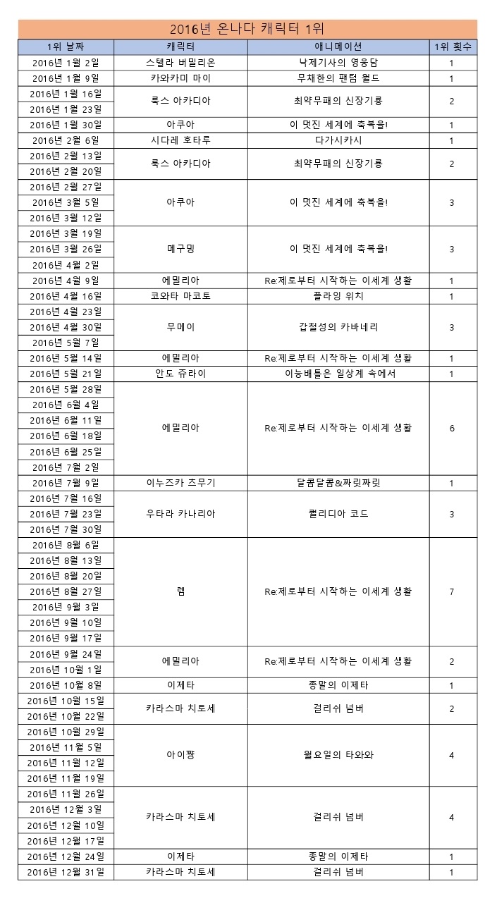 샤인페이스 온나다 캐릭터 1위 모음 (2015/12/19~2017/11/18) [기타] 작성일시 : 2017. 11. 24 (22:43) 조회 : 3,111 / 댓글 : 2 심심해서 온나다 1위 캐릭터 표를 만들어봤습니다. 날짜는 빌보드 차트처럼 매주 토요일로 했습니다.2015년 이전의 순위 자료는 왜 없어졌는지 모르겠네요ㅠㅠ현재 블렌드 S의 마이카가 6주째 1위중ㅋㅋ 11추천 글쓰기스크랩 신고