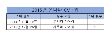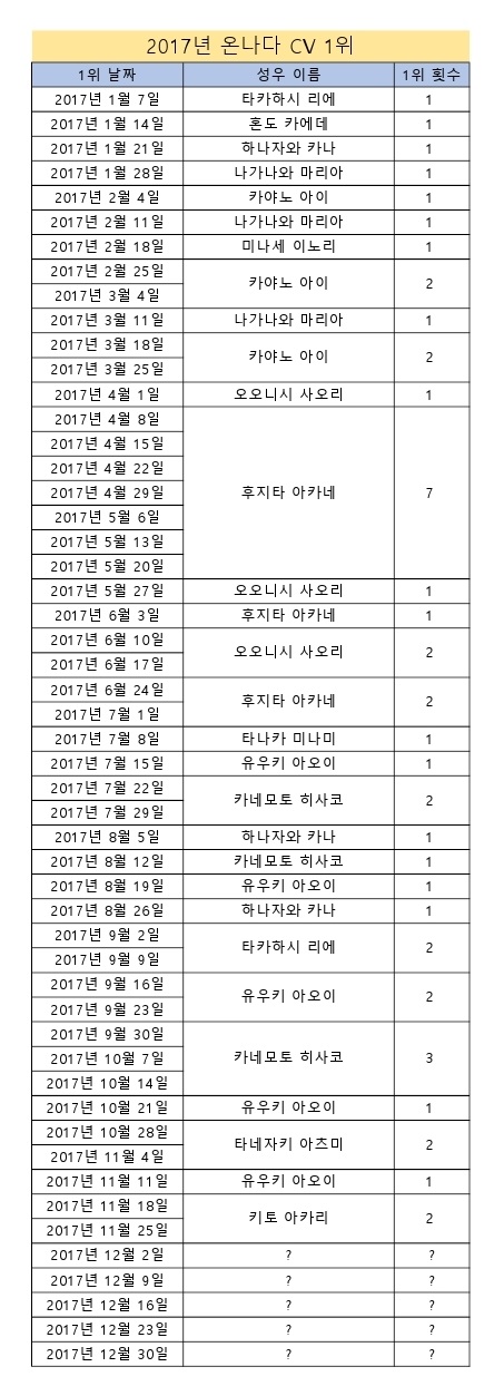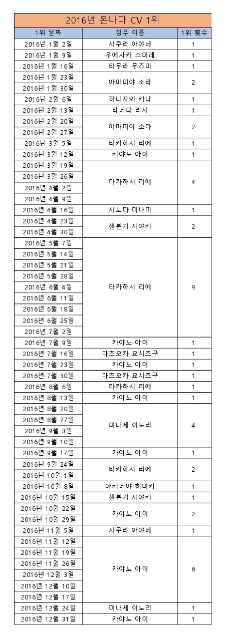샤인페이스 온나다 CV 1위 모음 (2015/12/19~2017/11/25) [기타] 작성일시 : 2017. 11. 28 (22:36) 조회 : 2,478 / 댓글 : 4 이번에는 CV(성우) 1위 모음 표를 만들었습니다.리제로의 영향으로 타카하시 리에씨의 활약이 눈에 잘 띄네요ㅎㅎ현재 키토 아카리씨가 2주째 1위중입니다.그러고보니 3개 차트 1위 모두 블렌드 S 네요ㅋㅋ 6추천 글쓰기스크랩 신고
