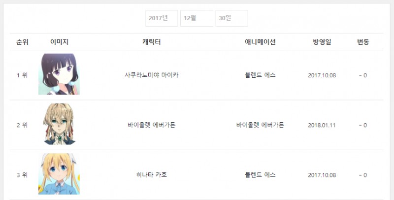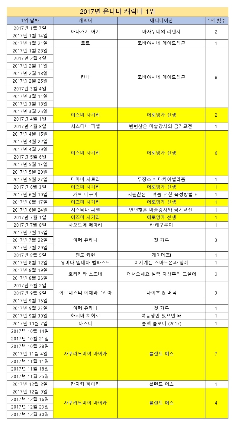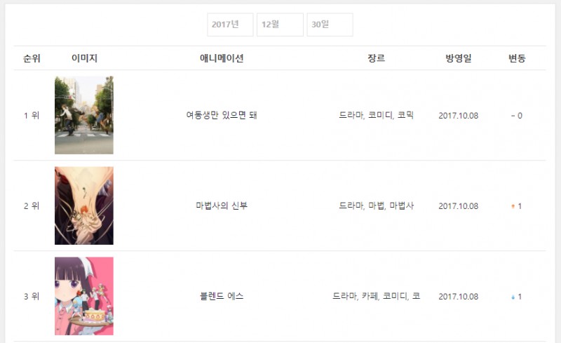 2017년 12월 30일자 온나다 종합차트입니다.