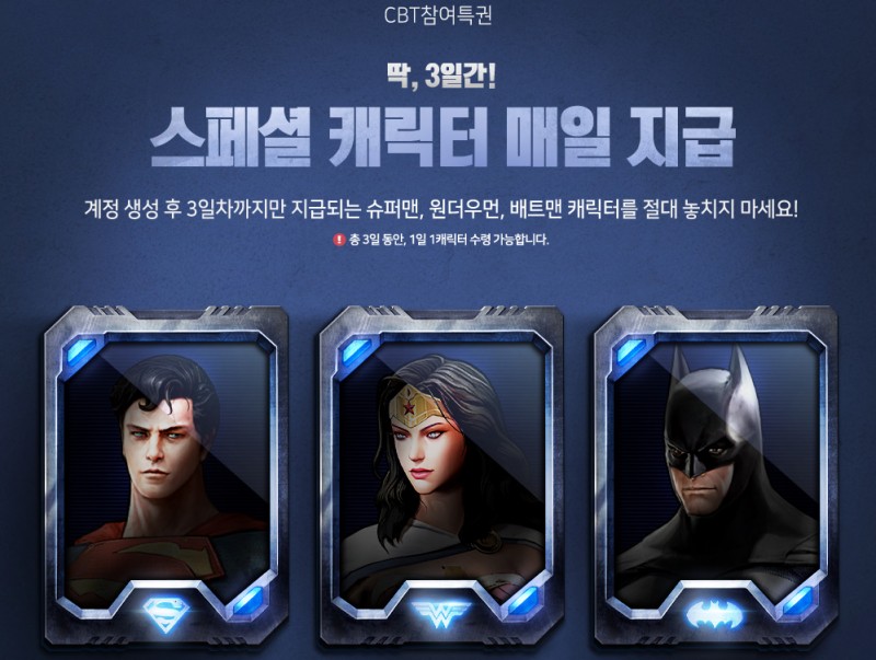 계정 생성 후 3일동안 슈퍼맨, 원더우먼, 배트맨 캐릭터를 얻을 수 있습니다.