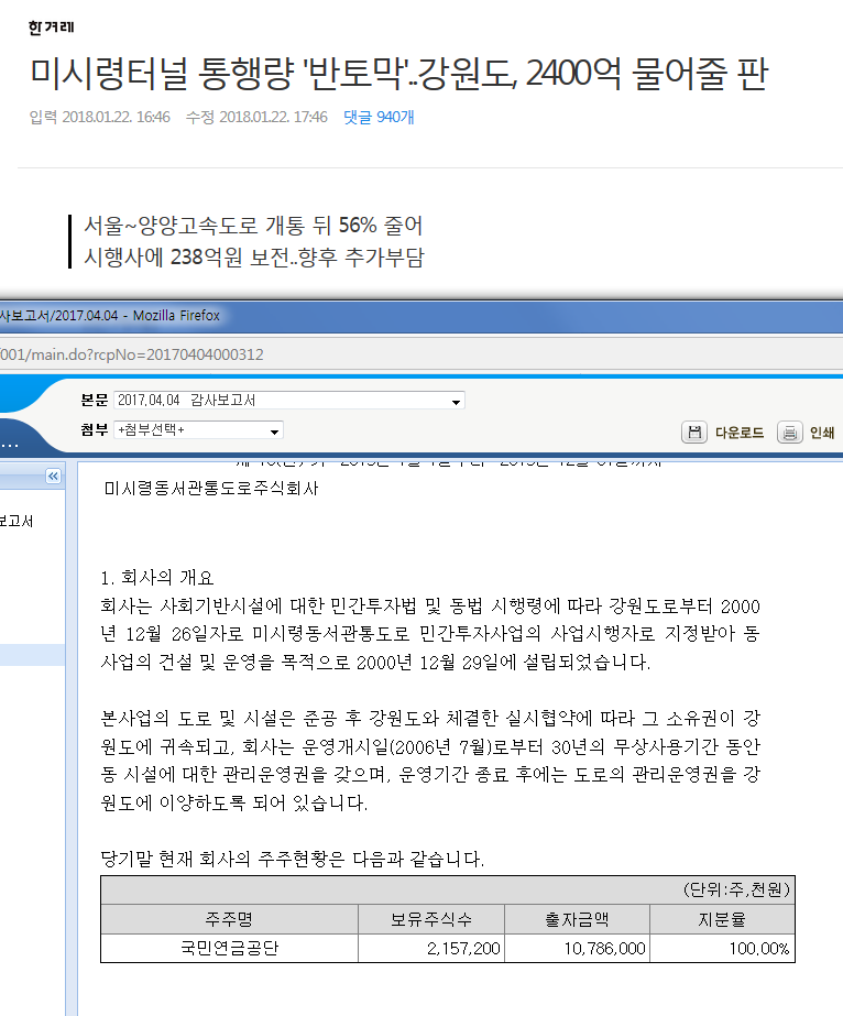 토모키 미시령터널 통행량 '반토막'..강원도, 2400억 물어줄 판 [기타] 작성일시 : 2018. 01. 22 (18:14) 조회 : 2,693 / 댓글 : 2 시행사 살펴봤더니, 국민연금공단 100% 지분 갖고 있네요.낚시 기사 출처(링크) : http://v.media.daum.net/v/20180122164608144 4추천 글쓰기스크랩 신고