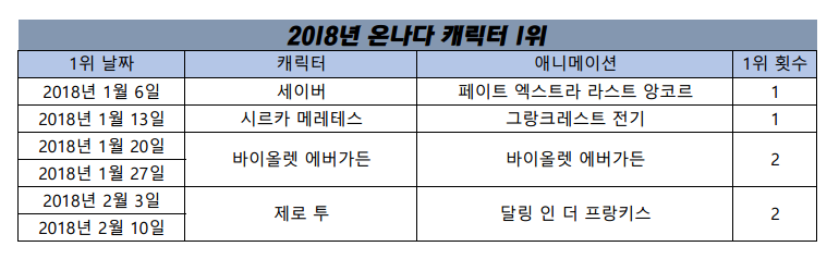 현재 1위 : 바이올렛 에버가든 (바이올렛 에버가든), 제로 투 (달링 인 더 프랑키스) [2주]