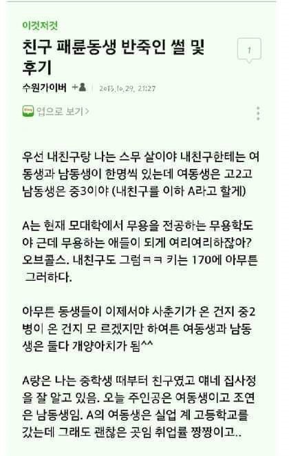유희 양아치 동생 참교육한 언니.jpg [일반] 작성일시 : 2018. 02. 22 (14:46) 조회 : 3,173 / 댓글 : 1 출처(링크) : https://blog.naver.com/beyondamuro8943/221210881673 3추천 글쓰기스크랩 신고