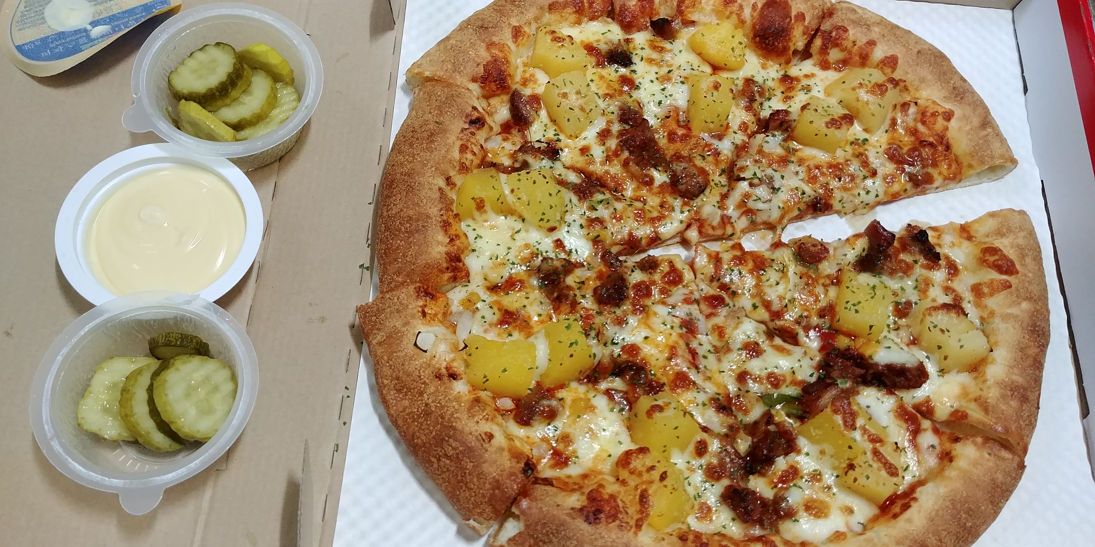 토모키 주말인데 피자를~!! [일반] 작성일시 : 2018. 03. 31 (16:45) 조회 : 2,352 / 댓글 : 2 피자스쿨 파인애플 피자인데, 1만원입니다.치즈 크러스트, 피클 2개, 갈릭소스, 콜라 1.25L 추가로 사왔는데 15,100원 지출했네요.역시 주말에는 후라이만 먹고 살 수가 없어요!! 7추천 글쓰기스크랩 신고