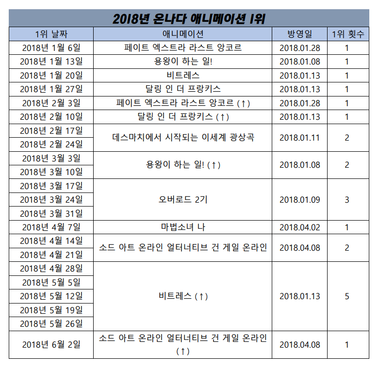 2018년 6월 2일자 온나다 종합차트입니다.