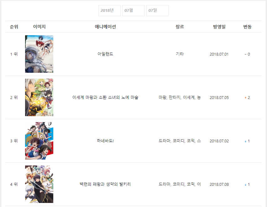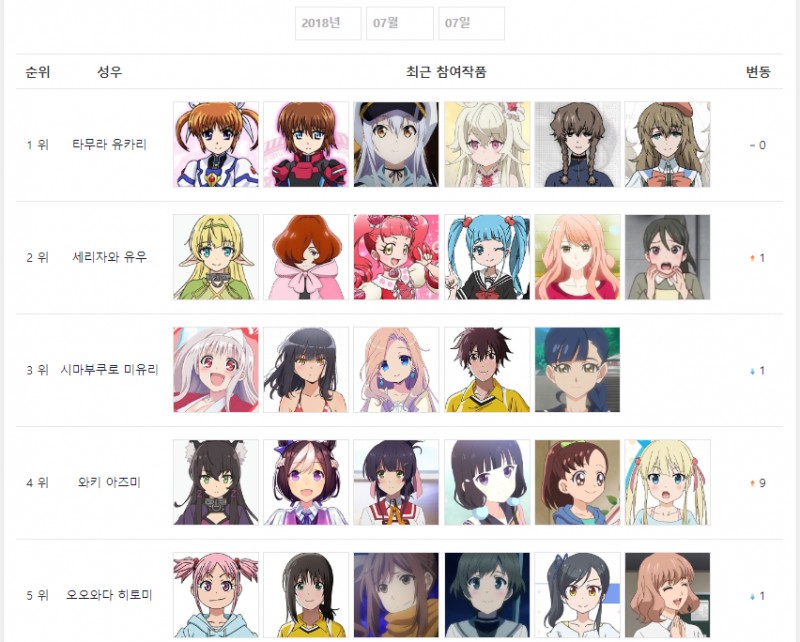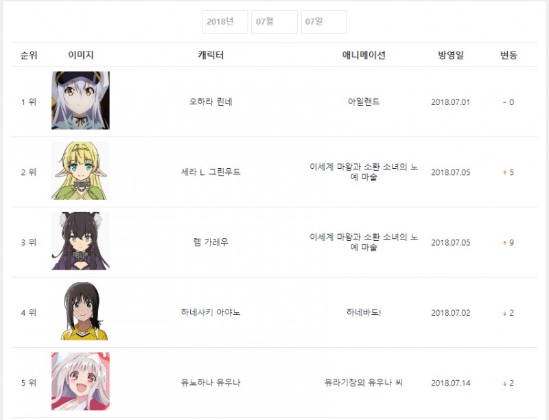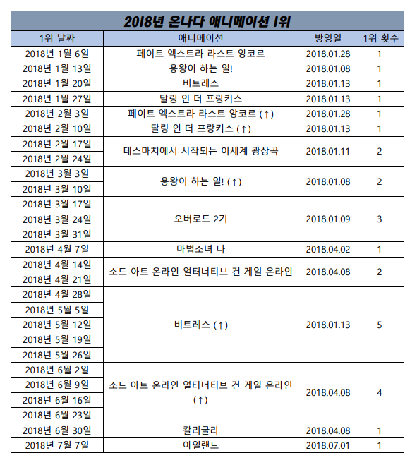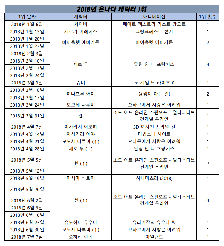 2018년 7월 7일자 온나다 종합차트입니다.