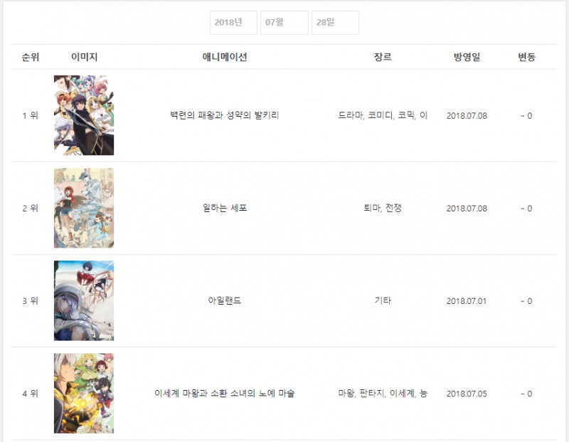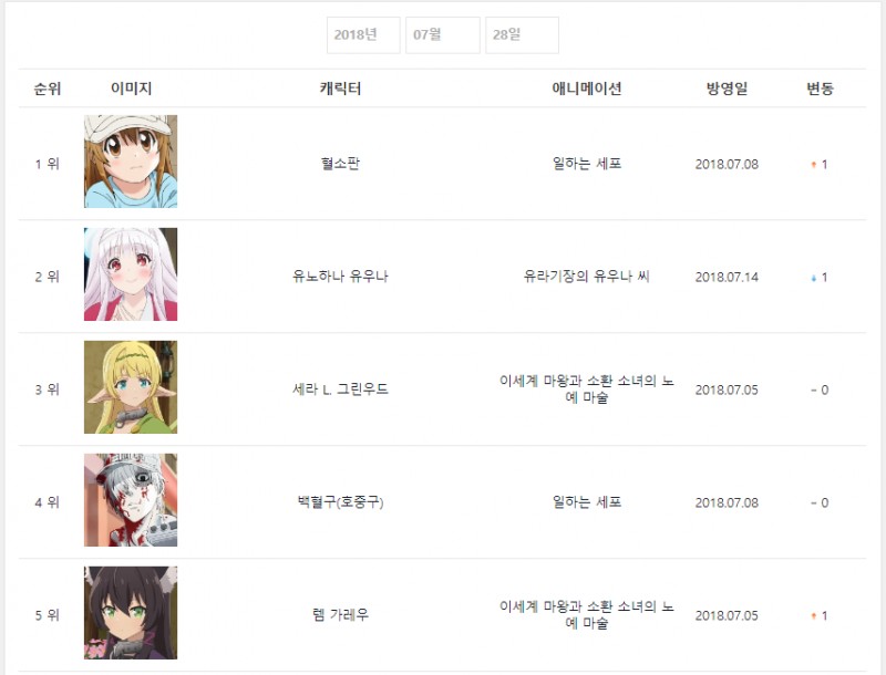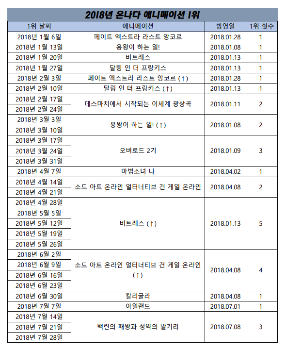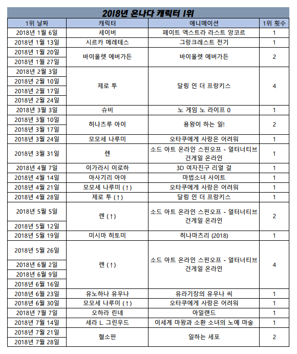 2018년 7월 28일자 온나다 종합차트입니다.