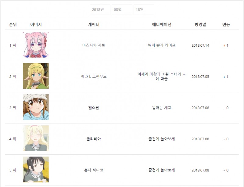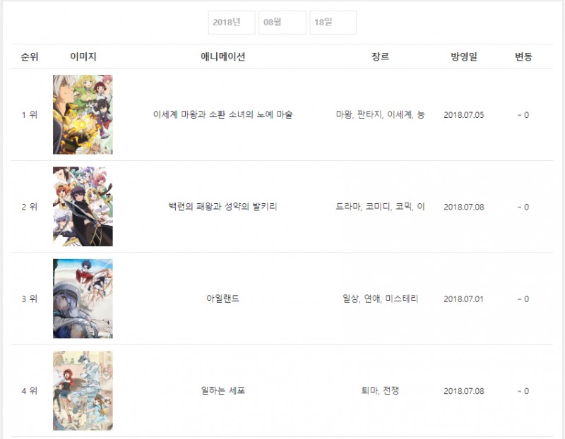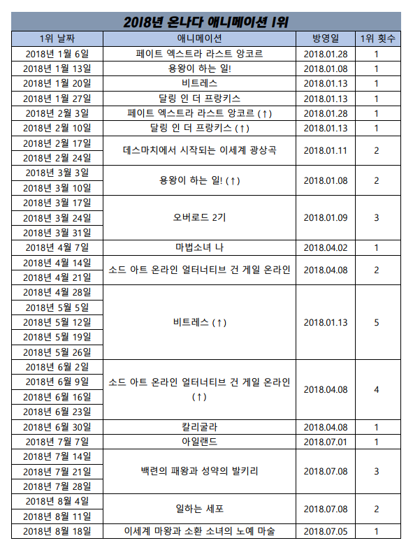 2018년 8월 18일자 온나다 종합차트입니다.