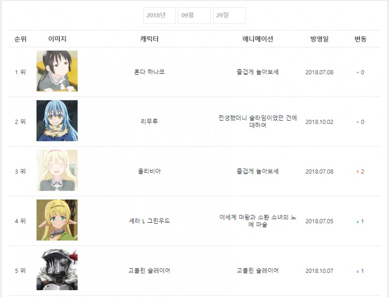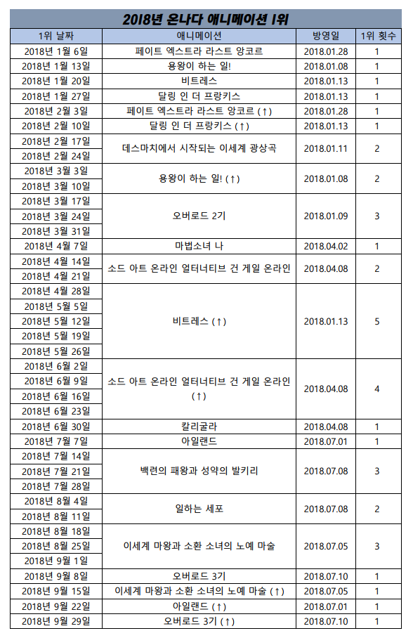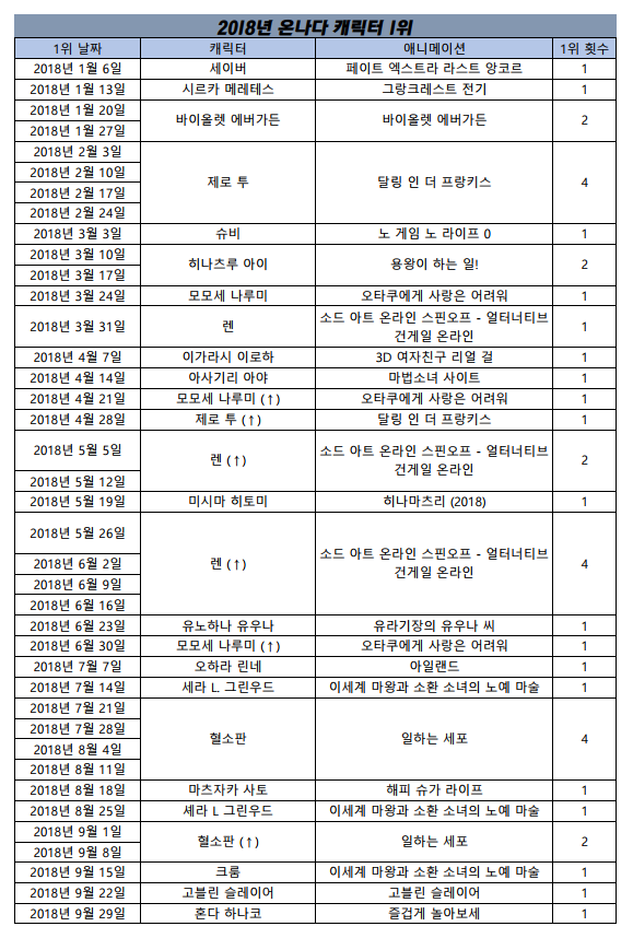 2018년 9월 29일자 온나다 종합차트입니다.