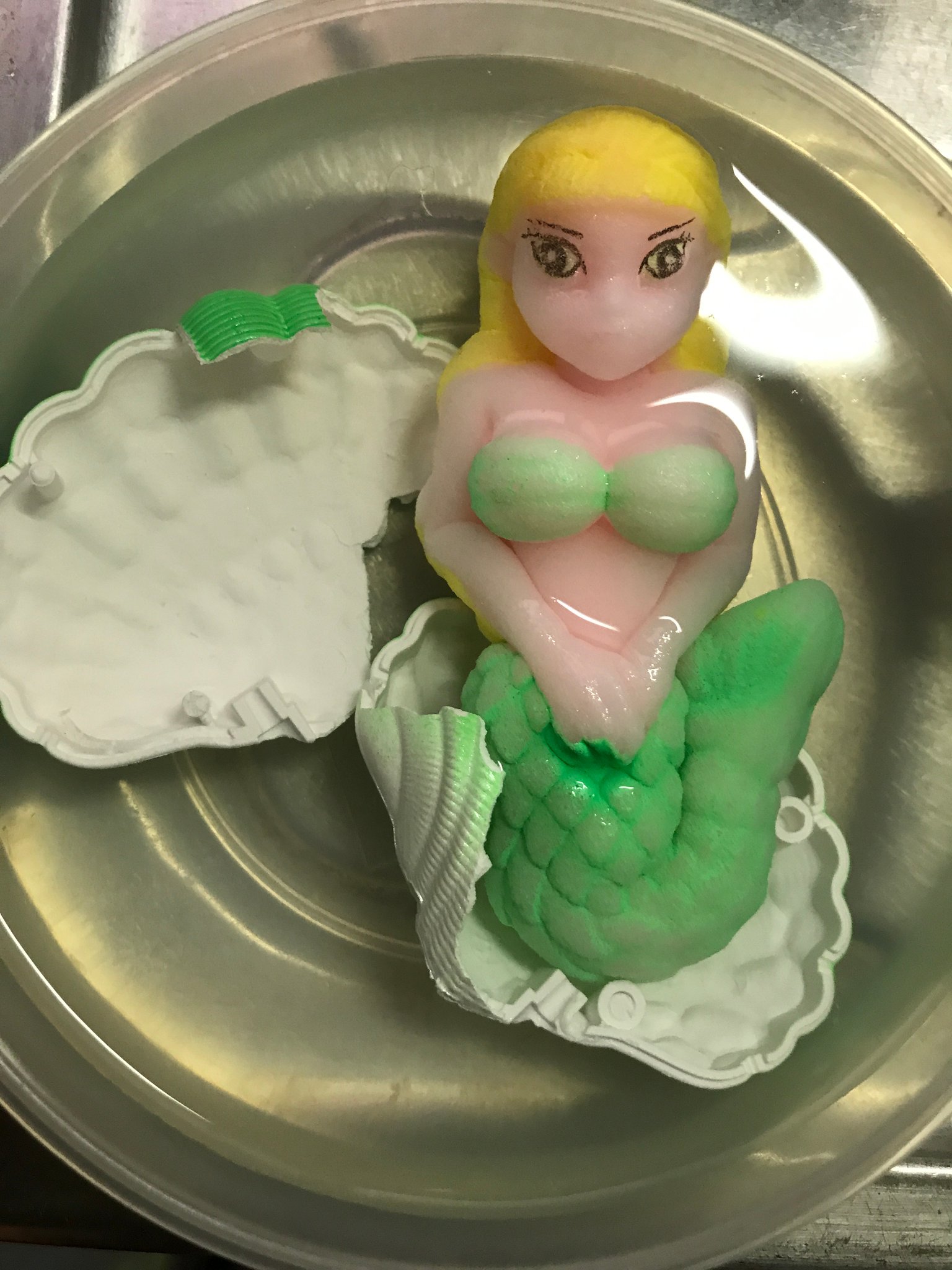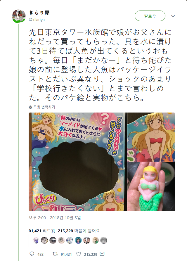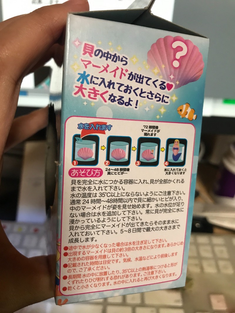 요전날 도쿄 타워 수족관에서 아가씨가 아버지에 말이야라도 사 받은, 조개를 물에 담그어 3일 기다리면 인어가 나온다고 하는 장난감. 매일 「아직일까」라고 애타게 기다린 아가씨의 앞에 등장한 인어는 패키지 일러스트와 많이 달라, 쇼크인 나머지 「학교 가고 싶지 않다」라고까지 말하게 했다. 그 패키지그림과 실물이 이쪽.