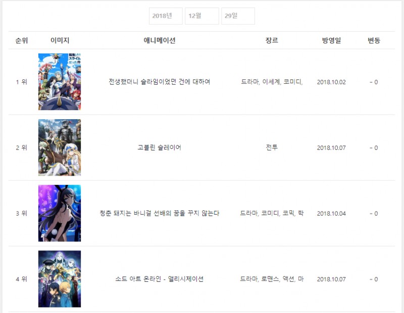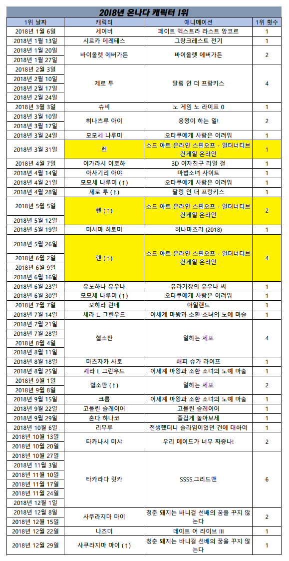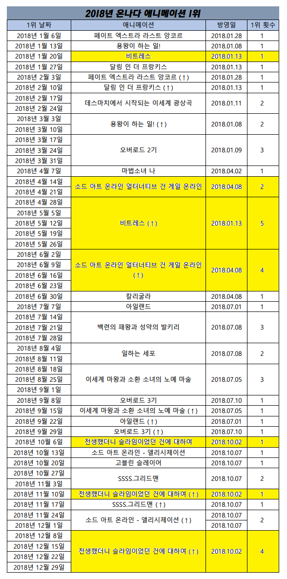 1위 - 비트레스 (2018.01.13), 소드 아트 온라인 - 얼터너티브 건 게일 온라인 (2018.04.08), 전생했더니 슬라임이었던 건에 대하여 [6주]