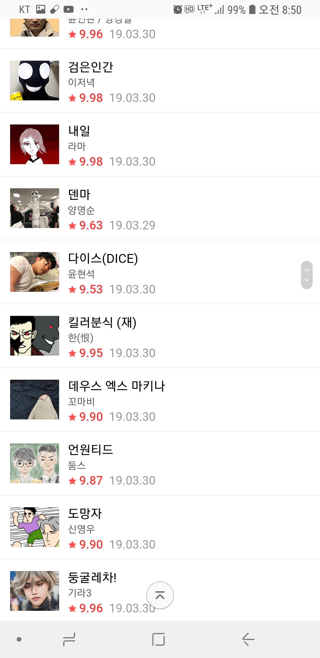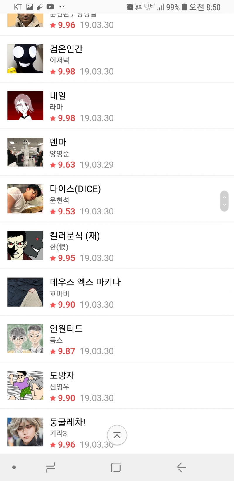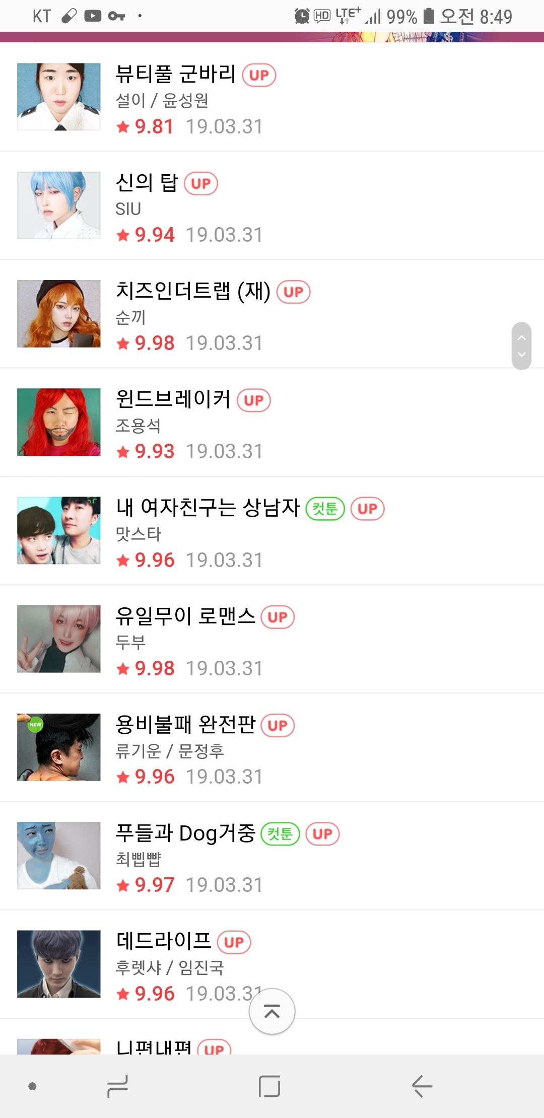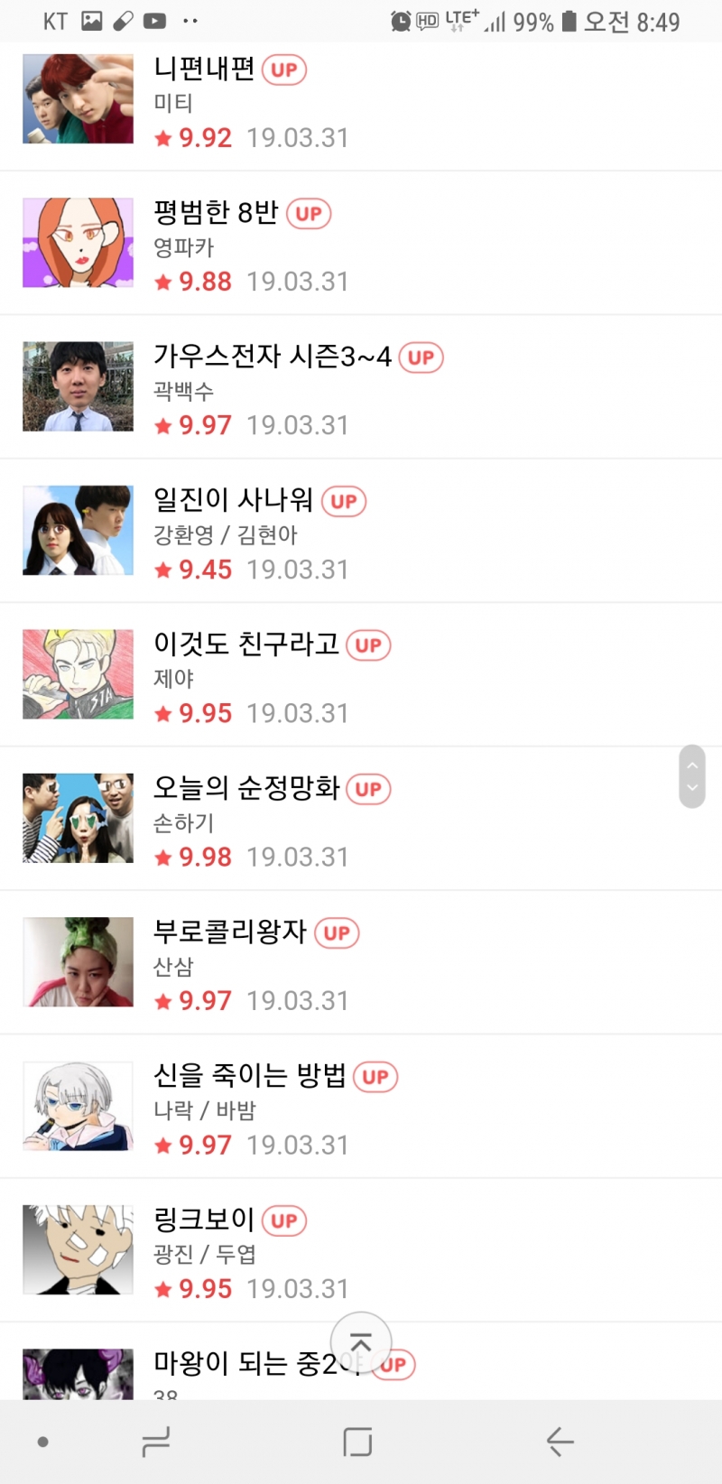핰 네이버 웹툰 ㅋㅋ [기타] 작성일시 : 2019. 04. 01 (17:03) 조회 : 2,318 / 댓글 : 2 님들 오늘 웹툰보셨음? ㅋㅋㅋㅋㅋㅋ 출처(링크) : https://comic.naver.com/webtoon/weekdayList.nhn?week= 6추천 글쓰기스크랩 신고