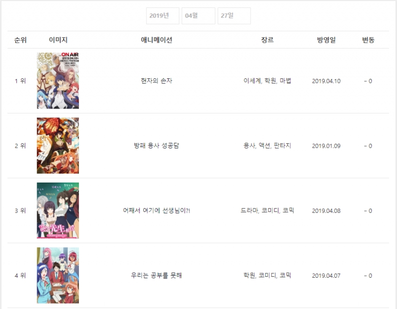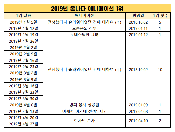 2019년 4월 27일자 온나다 종합차트입니다.