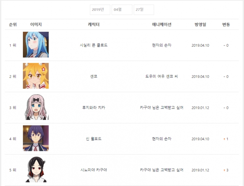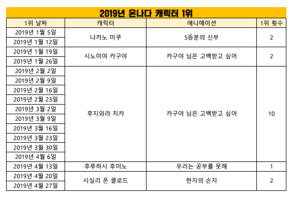 현재 1위 : 후지와라 치카 (카구야 님은 고백받고 싶어) [10주]