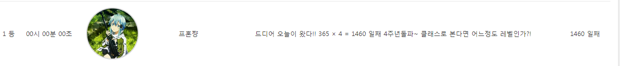 프혼쨩 드디어 출석일수 4년 돌파!! 이정도면 나 자신이 봐도 대단해 보이는데... [일반] 작성일시 : 2019. 04. 28 (00:10) 조회 : 1,852 / 댓글 : 6 드디어 여기까지 왔습니다. 여기까지 오면 뭐라고 표현해야 할지... 사랑? 집착? 노력? 끈기? 집중? 필사? 나태? 욕심?아무튼 너무 기쁘고 뿌듯하내요. ㅎㅎ 16추천 글쓰기스크랩 신고