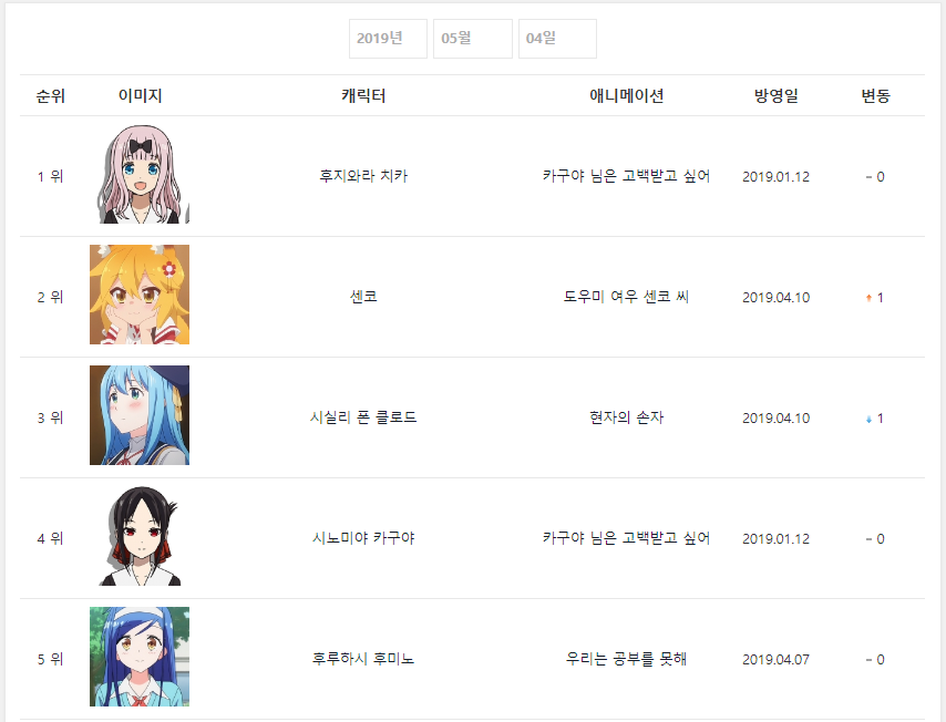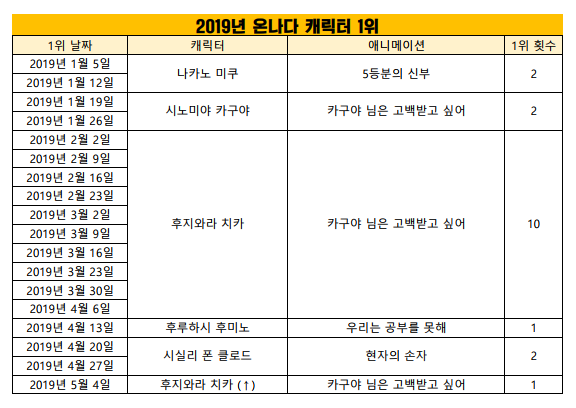 현재 1위 : 후지와라 치카 (카구야 님은 고백받고 싶어) [11주]