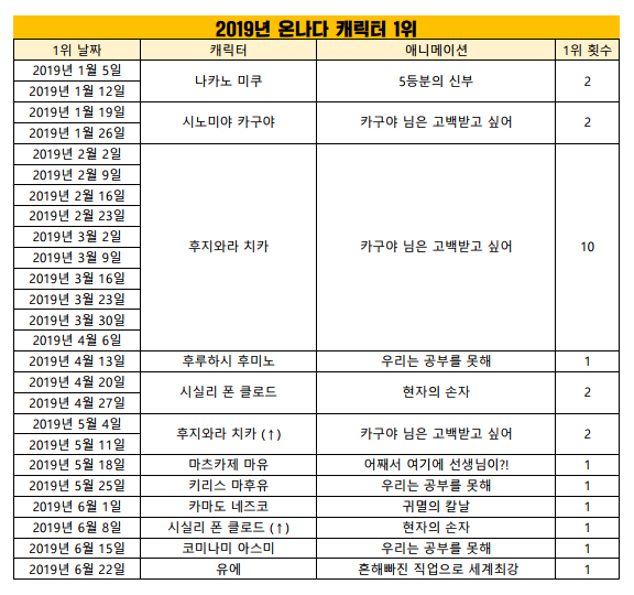 현재 1위 : 후지와라 치카 (카구야 님은 고백받고 싶어) [12주]