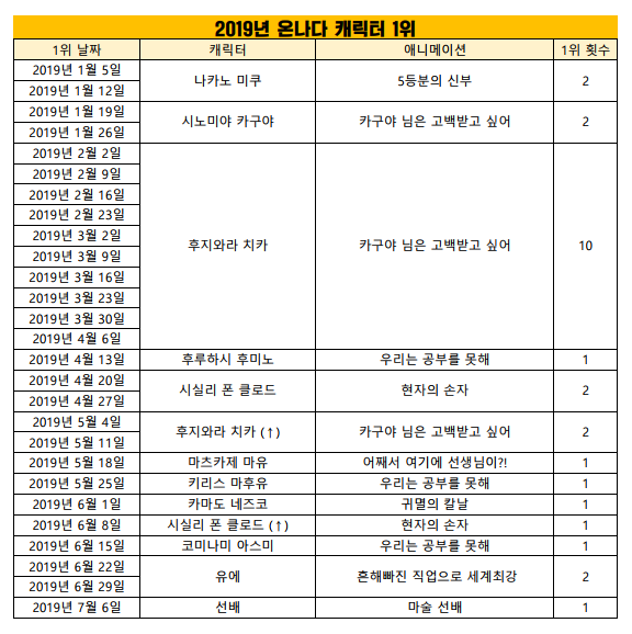 현재 1위 : 후지와라 치카 (카구야 님은 고백받고 싶어) [12주]