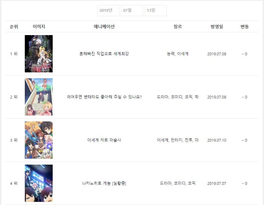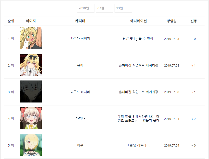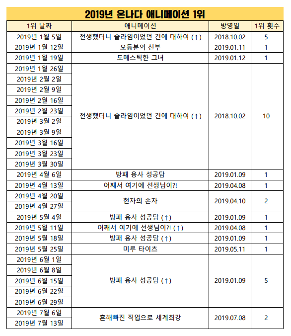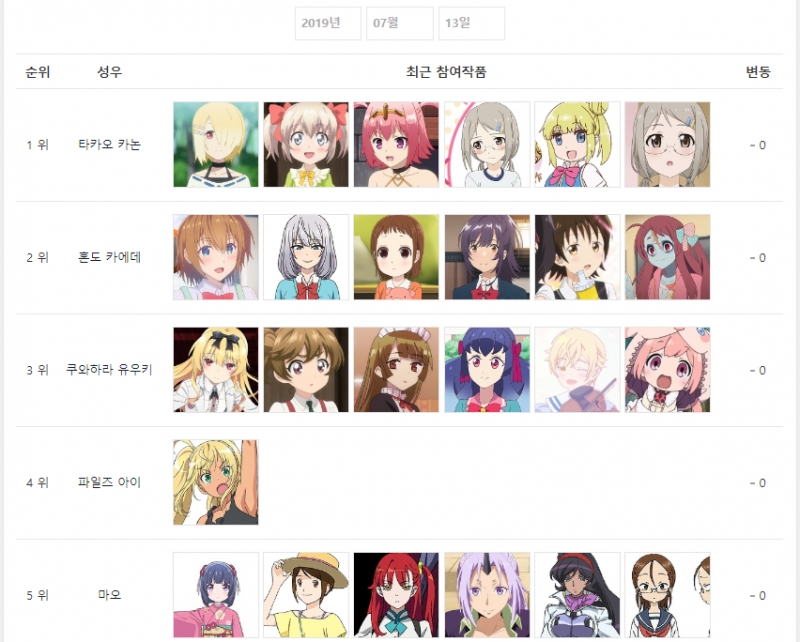 2019년 7월 13일자 온나다 종합차트입니다.