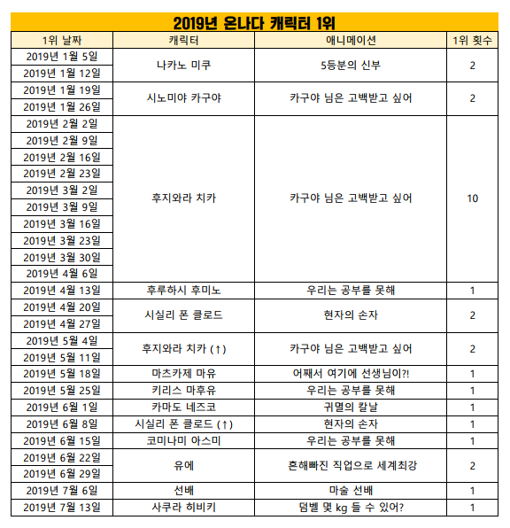 현재 1위 : 후지와라 치카 (카구야 님은 고백받고 싶어) [12주]