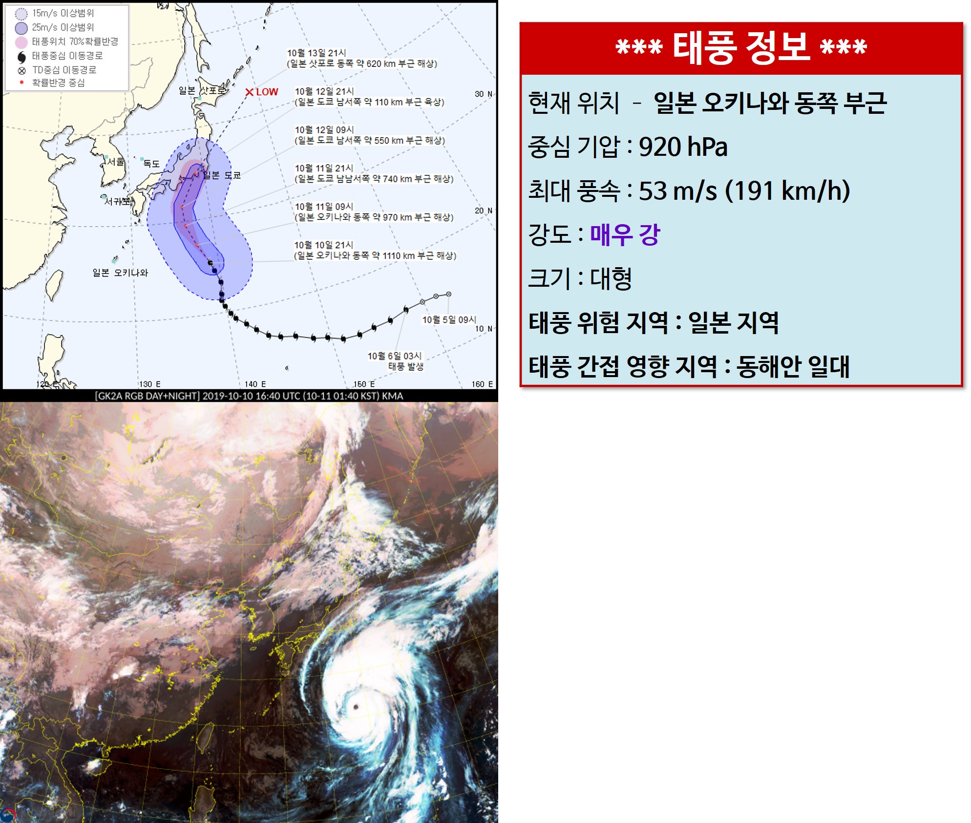 JINI 일본으로 가는 태풍의 정보입니다. [일반] 작성일시 : 2019. 10. 11 (01:56) 조회 : 2,045 / 댓글 : 1 태풍이 워낙 커서 일본 전역에 피해를 줄것으로 예상되며, 우리나라에도 간접 영향이 있을 예정입니다. 4추천 글쓰기스크랩 신고