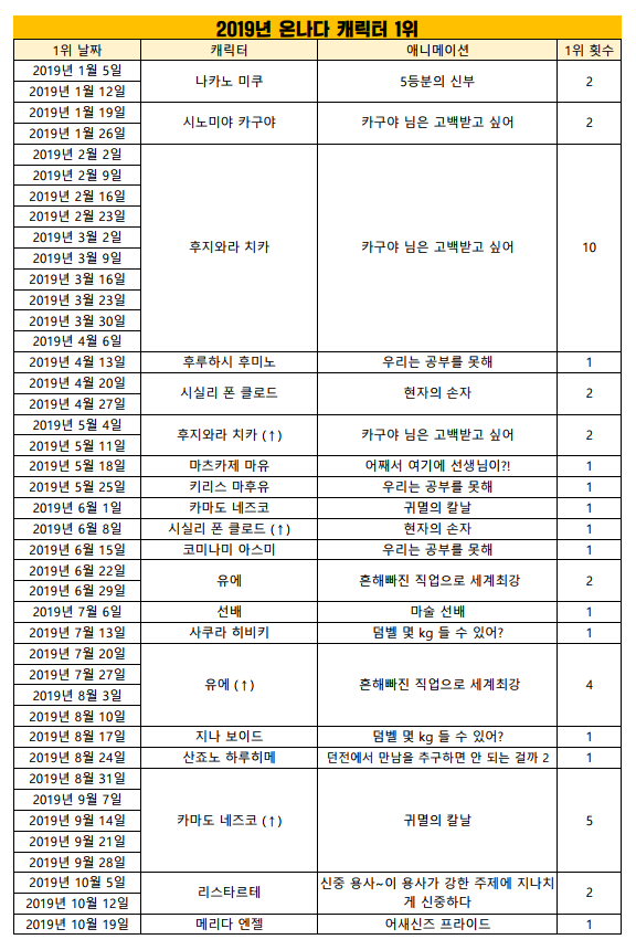 2019/10/19일자 온나다 종합 차트