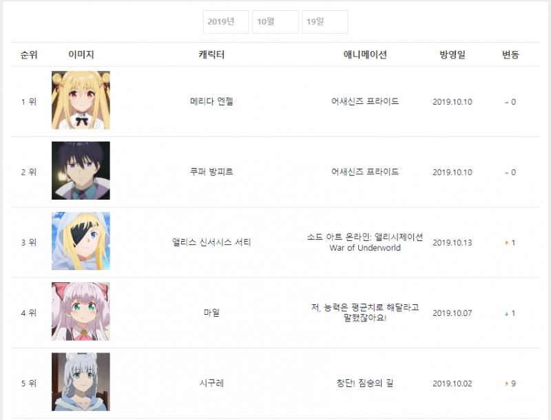 2019년 10월 19일자 온나다 종합차트입니다.