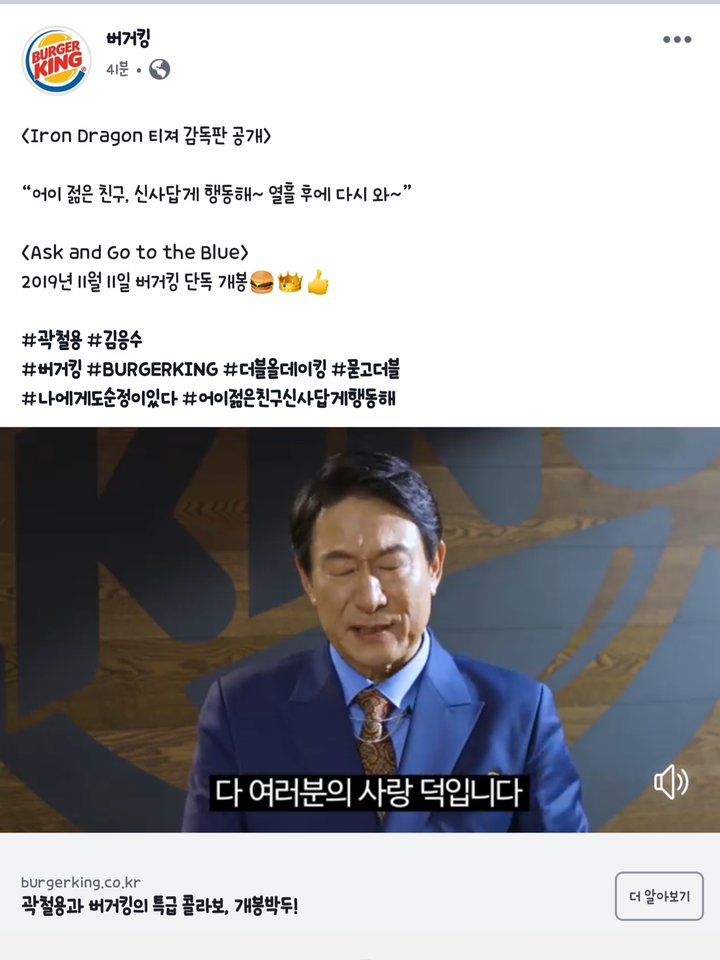 TMTonejae 드디어 10일만 지나면 [일반] 작성일시 : 2019. 10. 31 (18:51) 조회 : 1,965 / 댓글 : 2 아이언 드래곤 햄버거 광고가 나옵니다버거킹 사딸라에 이어 곽철용까지유행 들어올 때 잘 활용하네요 나중에 김수미, 김영철(사딸라 아조씨), 김응수(아이언 드래곤) 이 세 분이 합동 콜라보 광고가 나올 것 같네요 제목도 개웃기네요Ask and Go to the Blue묻고 더 블루 가 ㅋㅋㅋㅋㅋㅋ 5추천 글쓰기스크랩 신고