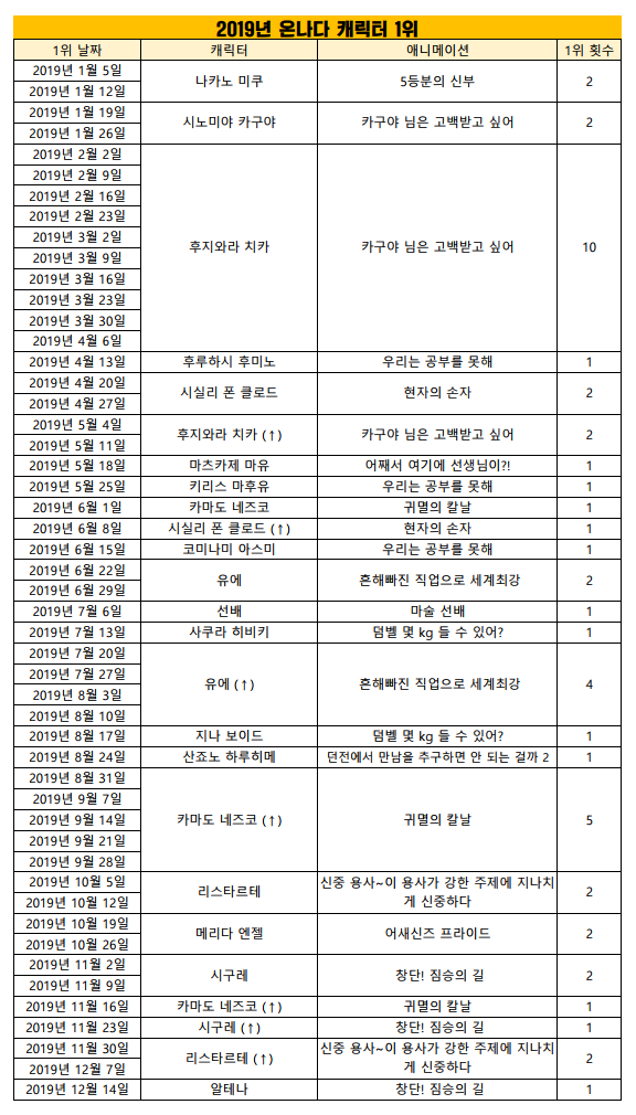 현재 1위 : 후지와라 치카 (카구야 님은 고백받고 싶어) [12주]