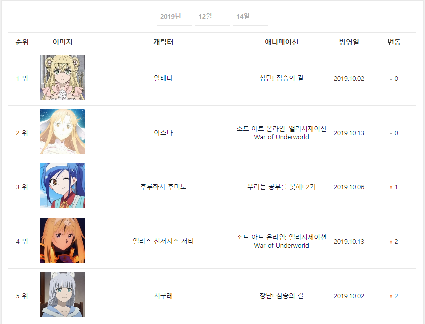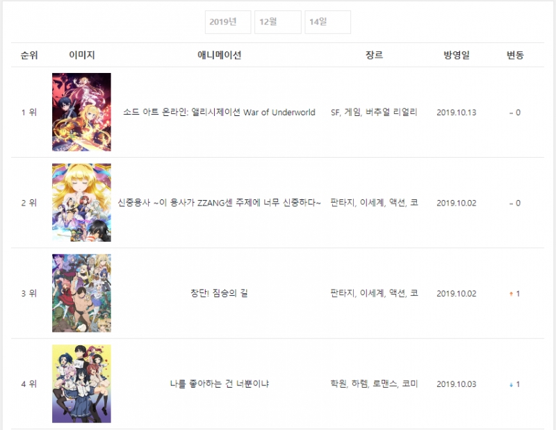 2019년 12월 14일자 온나다 종합차트입니다.