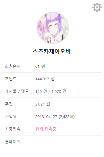 띵조 뭔가 프로필을 올리는게 유행인가요? [일반] 작성일시 : 2019. 12. 20 (02:11) 조회 : 2,221 / 댓글 : 6 덕력이 줄어서 애니 안본지 2년 되어가네요 휴덕은 있고 탈덕은 없다지만... 할배는 글 하나 흘리고 다시 사라집니다 11추천 글쓰기스크랩 신고