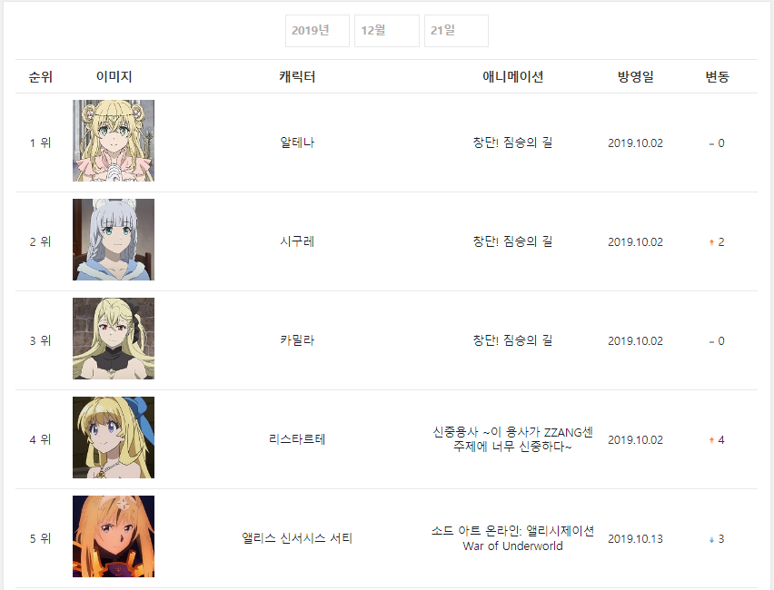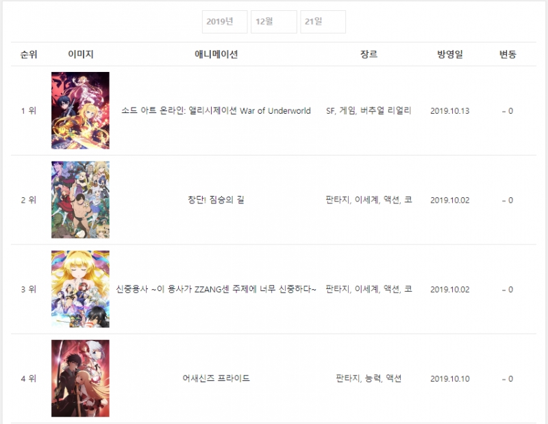 2019년 12월 21일자 온나다 종합차트입니다.